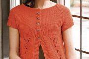 Далее кофта вяжется длиной тридцать три сантиметра. После того, как вы связали эту длину полотна, продолжайте вязать резинкой 1х1, после чего вязание нужно закрыть. Остается только выполнить рукав. Пришло время снять петли с дополнительной булавки и переместить их в работу. Во время вязания кругового ряда, нитку надо присоединить и вязать лицевой гладью. Набор петель производится по пройме. Сначала свяжите два сантиметра лицевой гладью, а потом один сантиметр платочной вязкой. Выполнив все ряды, петли закрывайте. Затем аналогично вяжите следующий рукав, и кофточку можно примерить.
