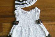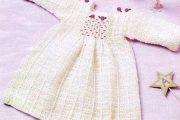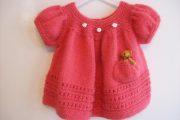Для новорожденной малышки, платьице вяжется совсем крохотным, а когда малышка подрастает легко довязать изделие по нижнему краю. Это можно сделать ажуром или даже нитью контрастного цвета при помощи тех же спиц или крючка. Тогда тем же материалом следует добавить яркий цветок на пояс или повязку.