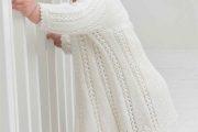 Для новорожденной также можно вывязать платье целиком, удобнее это делать снизу. Спицами набираются петли для рисунка на юбочке. Вяжется на необходимую высоту. Если петелек слишком много и юбка получается слишком пышной, следует сделать убавление до перехода на плоский узор передней или задней частей.