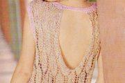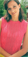 Продолжаем создавать летний топ с ажуром и переходим к созданию переда. Провязывается эта делать спицами по аналогии со спиной. Но здесь будет довольно большое V – образное декольте. Что бы его создать, на высоте сорока двух сантиметров от нижней части, вам необходимо поделить полотно на две одинаковых составляющих и завершить их отдельно с созданием выемки горловинки (взяв за основу выкройку с рисунком). Провязав шестнадцать сантиметров, от начала пройм, можно делать убавления для плечевых скосов изделия. Дальше, готовые элементы ажурного изделия соединяются по боковым и швам плечей. Проймы обрабатываются на основе сдвоенной бейки. В этом случае, по контурам пройм следует поднять на интсрументы петельки и связать вкруговую из мохера лиц. гладь на протяжении пяти – шести рр.. На завершающем этапе, полотно сгибается вдвое. Осталось только прикеттлевать его по лицевой стороне.