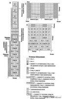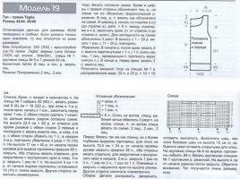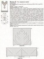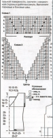 На первом этапе создается спинка. Вам необходимо осуществить набор ста трех п. и связать спицами пять рядов из мохера. В шестом (он будет изнаночным) наберите на добавочную спицу петельки начальной цепи. Далее вязание сгибается вдвое (изнанкой вовнутрь). Затем, вам следует поднять по одной петлице наборной цепи на инструмент, который находится в работе, помещайте перед всеми петельками и вывязывайте их совместно лиц., как на рисунке (22а). После этого, работа над ажурным топом продолжается вертикальными полосками их мохера и хлопчатобумажной пряжи от пяти разных клубков. При этом петельки распределяются таким образом: восемь п. лиц. гладью из мохера, двадцать девять п. ажура (второй вид пряжи), двадцать девять п. ажура из мохера, двадцать девять п. ажура (второй вид пряжи), восемь п. их мохера лиц. гладью. Обратите внимание, что вязание спицами ажурного узора для топа идет на основе схемы с первого по сорок восьмой рр., а дальше, идет повтор с пятнадцатого по сорок восьмой р. Схема указывает лишь лиц. ряды. В изнаночных – все петельки и все набросы провязываются изн. Чтобы избежать в ходе работы появления дырочек, меняя пряжу, следует перекрестить нитки. Достигнув высоты топа в сорок четыре сантиметра от нижней части, нужно по обеим сторонам для пройм закрыть в первую очередь по четыре п., дальше один раз по две и два – по одной во всех вторых р. Провязав шестнадцать сантиметров пройм для выемки горловинки, можно закрыть центральные тридцать одну п. и оставшиеся две составляющих провязать самостоятельно друг от друга. В тоже время, с началом выемки для скоса плеча изделия, можно закрывать по краю один раз семь п. и еще три – по семь п. во всех вторых р.