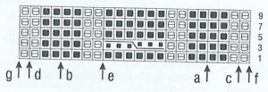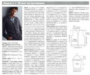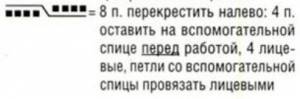 - Далее переходите к узору с косами. Сначала идет кромочная, затем раппорт С – А, три раза А – В, 10 П между А – Е, восемь П планки, кромочная. Отверстия под пуговицы оставляются по левому краю.