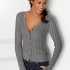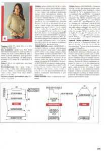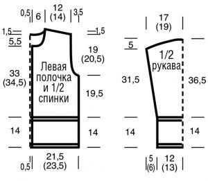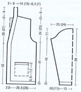 - Через 42 см от начала работы убавьте левый край для V-образной горловины по 1-ой петельке 12 раз в каждом шестом ряду. Закрытие плечевых скосов происходит так же, как на спинке изделия.