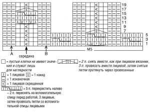 - Чтобы связать карман наберите 26 петелек. Вяжите 17 рядов лицевой гладью. Прибавьте четыре петли: кромочная, два раза повторите А – В, кромочная. Следующие 11 Р работайте узором с косами.