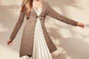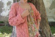 Прибавление делается семь раз по одной единице в каждом восьмом ряду. Вяжите дальше, пока не провяжете шестьдесят от начала, затем все вязание закрывайте. Оба рукава вяжутся одинаково, поэтому с правым рукавом все понятно. После окончания рукавов, остается только собрать ажурный кардиган из отдельных деталей. Для начала все детали отпаривают, потом сшивают изделие по плечам, вшивают рукава по швам и сшивают боковые швы. В конце потребуется крючок, которым делается обвязка каждого края узором «Рачий шаг». В самую последнюю очередь необходимо заняться изготовлением пояса для кардигана. Для этого набирается на спицы семь петель, а потом вяжется из них достаточная длина обычным узором, например платочной вязкой, после чего все закрывается. Готовый пояс отпаривается и немного потягивается за края. На уровне талии делаются специальные шлевки для пояса при помощи крючка. Каждая шлевка должна быть связана из семи воздушных петель. Пояс вдевается в готовые шлевки. Теперь ажурный кардиган совсем готов и его можно примерить.