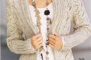 Данная модель летнего кардигана с ажурным узором, выполняется тонкой пряжей из смешанных ниток (шерсть с акрилом). Чтобы связать размер 44, нужно приобрести восемьсот граммов тонкой смешанной пряжи, спицы №7 и крючок №4. Ажурный рисунок вяжем спицами, следуя указанию схемы. На ней вы увидите лицевые полосы. Четные выполняются исключительно изнаночными петлями, даже если речь идет о накидах. Плотность этого вязания должна составлять одиннадцать петель в десяти сантиметрах по горизонтали и двенадцать рядов в десяти сантиметрах по вертикали. Описание работы начинаем со спинки. Для нее выполняется набор спицами петель, в количестве пятьдесят одна. Продолжайте работу, провязывая семьдесят два ряда по указанию схемы. После этого выполните платочной вязкой еще тридцать. Затем необходимо закрыть двадцать одну петлю. Это должны быть петли, расположенные в центре полотна. Далее продолжайте вязать каждую часть спинки отдельно. Выполните по шесть полос для каждой из них и закройте по пятнадцать звеньев для плеч.