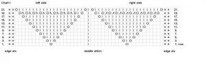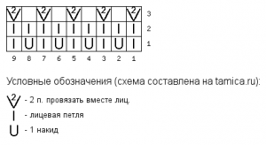 Следующий р. нужно связать как первый: чередуем н. и ЛП, и прибавка. Дальше по схеме: прибавка, а после, только ЛП. Потом провязываем по две п. вместе, кроме двух (трех) последних, их вяжем ЛП.