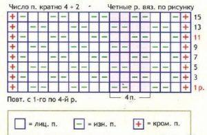 Синей пряжей наберите сто восемьдесят шесть петелек и вяжите двенадцать рядов согласно схеме, которая будет продемонстрирована в этой статье. Затем продолжайте работу, предварительно распределив петельки таким образом: восемь п. по рисунку, одна п. изн. глади, 1 лиц. глади и сделайте такое повторение еще двенадцать раз. потом одна п. изнаночной гладью и восемь звеньев по схеме.