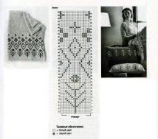 Возьмите белую пряжу и наберите сто шестьдесят девять петелек, из которых вяжите лицевую гладь. Сделав двенадцать полос, переходите на узор, схема которого будет представлена в статье. Следуя ей, выполняйте следующие манипуляции: проделайте три п. белым цветом и повторите восемнадцать звеньев раппорта девять раз. После этого свяжите петельку после раппорта и три штучки белой пряжей. Вам необходимо связать с первого по шестьдесят шестой ряд. Затем выполняйте белым цветом до тех пор, пока высота изделия не станет семьдесят шесть сантиметров. Далее орнамент вяжется в зеркальном отражении. Остается только связать ниткой белого цвета 12 р. и закрыть все петельки.