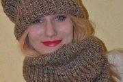 Чтобы связать спицами такую женскую шапку английской резинкой и с отворотом, необходимо приобрести 250г пряжи, которая состоит из шерсти, полиамида и альпака, а также круговые и чулочные инструменты под номером № 6. Схема вязания английской техники описана выше по тексту, поэтому нет необходимости повторяться. Плотность шапки с отворотом составляет десять на десять сантиметров = 10 п. на 32 круг. ряда.