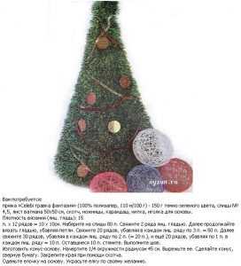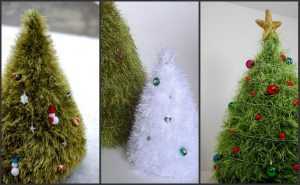 Связать из травки конус, сшить его грани и одеть на картонную основу. Размеры заготовок можно рассчитать самостоятельно, и создать елочки разной величины. Донышко лучше выполнить из плотной бумаги или фетра.