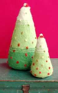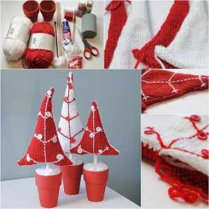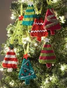 Начинающим вязальщицам лучше начать с ярких елочек, как на фото. Они связанны лицевой гладью и украшены подручными материалами.