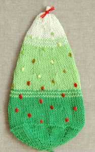 - Далее вяжем по кругу, узор – лицевая гладь. Постепенно убавляем полотно, меняя цвет ниток и добавляя колоритные полоски.