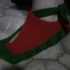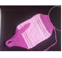Теперь с обеих сторон набираем петельки и начинаем делать треугольники. Можно поменять цвет пряжи. Одновременные убавления в начале и конце ряда делаем до тех пор, пока не останется 6 петелек. Наша заготовка готова. Остается лишь сшить наш прямоугольник по краям и вывернуть швом в середину ступни: