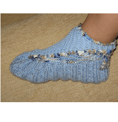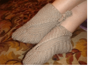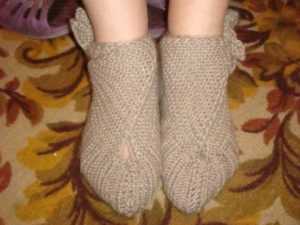 Вот так оригинально и просто смотрятся вязаные толстыми спицами тапки. Оригинальность их в их простоте. Займемся вначале общим описанием работы над ними: