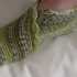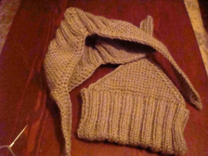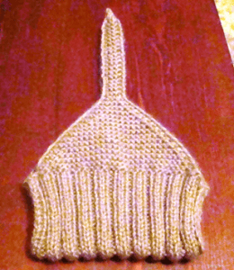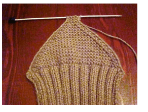 Для этого после резинки вяжем платочным узором. При этом с первого же ряда начинаем выполнять убавления с обеих сторон полотна по 2 петли. Когда останется 5 петель убавления прекращаем. На этих петельках будут формироваться завязки. Длина их зависит от размера и формы ножки, на которую будем примерять обувку. В среднем придется пройти 20-22 рядков. Теперь набираем по краю резинки петли и вяжем в зеркальном отражении с другой стороны полотна. Вот такая заготовка получается в итоге: