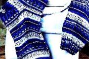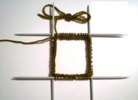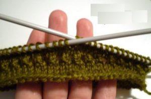 Наберите на спицы под номером № 3,5 шестьдесят петелек из темной пряжи и распределите их на четыре инструмента по 15 штук на каждую. Приступаем к вязанию отворота. Сделайте пять р. по кругу лиц. глади: первая полоса состоит из двух петлиц, которые вяжутся совместно лицом и одного накида, которые чередуются между собой. Остальные четыре р. выполняются лиц. гл.
