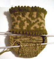 После этого подарок на день защитника Отечества вяжется по такой схеме: семнадцать кругов вяжите жаккардовым узором согласно представленной схеме. После этого шесть кругов лиц. гл. и один чередованием двух совместных петлиц и накида. Снова три полосы лиц. гл. Выверните работу и продолжайте вязание светлой ниткой, примерно восемь сантиметров. Закончив этот участок работы, переходите на оформление пятки. Для этого необходимо перенести петлицы с двух спиц на четвертую и ввести в работу еще одну пряжу контрастного цвета. Сделайте семь сантиметров лиц. глади.