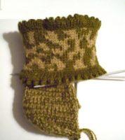 Своих защитников Отечества необходимо держать в тепле, поэтому лучшим вариантом будет связать носки с камуфляжным узором на отвороте. Для работы понадобится пряжа, которая состоит из шерсти и акрила в равных пропорциях. Цвет должен быть темно-зеленый и бежевый. Еще понадобятся пять чулочных спиц под номером № 3,5 и 4. Схема узора будет представлена в статье.