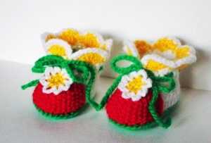 Сшивать заготовки лучше иголкой, а вот чтобы связать украшения – листочки и цветочки подойдет крючок №2. Мелкими бусинками украсим наши пинетки в форме ягодки.