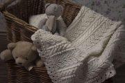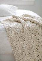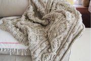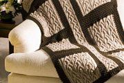 Этот плед выполнен спицами и украшен сетчатым узором и жгутами. Рекомендовано использовать белую пряжу, чтобы изделие имело невероятный вид. Его можно презентовать, как подарок на Святки, который будет востребовано в семье во время прохладных вечеров.