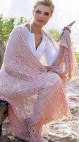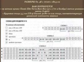 Размер полотна составляет 123 на 137 см. Пряжа используется акриловая в количестве десяти мотков и круговые спицы под номером № 4,5, длиной сто сантиметров.