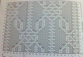 Наберите 281 петлю и вяжите восемь рядов лицевыми петлицами. В последней из этих полос сделайте равномерное прибавление десяти звеньев. Далее работа выполняется по следующей схеме: