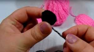 - В следующем рядочке в области мордочки снова по 2 вместе, но уже только лицевыми (должно остаться 5), до нее – 19, а после – 18, так как придется захватить одну лишнюю петельку для мордашки. С внутренней стороны эти пять петель делаем изнаночным способом, а в следующем лицевом из них вяжем первые и последние две совместно и одну между ними. В итоге останется 3.