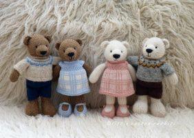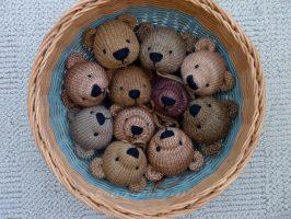Вязание начинается с головы медвежонка. Нанизывайте десять п. выполняя л. гл. С первого по одиннадцатый р. делайте увеличения по восемь п. в каждой лиц. полосе. Начиная с тринадцатого и по двадцать первый р. – работайте по прямой. С двадцать третьего и по тридцать третий уменьшайте п. в количестве семи штук. Петлицы, которые остались на спице – необходимо закрыть любым известным для вас способом. Мордочка мишки вяжется крючком. Для этого сделайте цепочку из четырех воздушных звеньев, а затем по кругу выполните 3 р. столбиков без накидов, прибавляя на повороте по три п. после этого 3 р. вяжутся прямо.
