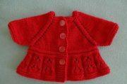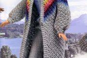Для спины наберите спицами 41 п. и вяжите согласно рисунка, уменьшая для проймы с двух сторон в каждом втором р. два раза по две петлицы. Когда высота будет 13 см, необходимо закрыть вырез горловины по центру в количестве 15 п. А каждую сторону вязать по отдельности. Чтобы вырез закруглить – закройте в каждой полосе еще два раза по одной п. На высоте пятнадцать сантиметров закрывайте все петли, а вторую сторону горловины выполните симметрично. Для правой полочки нужно набрать 20 п. Левая пройма выполняется так, как и спинка. С правой стороны убавляют в каждом втором р. пять, две, одну и одну петельку. На высоте 15 см закрывают все оставшиеся звенья. Левая полочка делается симметрично. Рукав также вяжется «путанкой» из сорока двух звеньев. Когда высота будет три сантиметра, необходимо закрыть центральные 4 п. и вязать далее. В конце закройте с двух сторон в каждом 2 р. два раза по 1 п., а оставшиеся звенья закройте одним приемом. Чтобы собрать одежку для куклы в единое целое, сделайте плечевые и боковые швы, рукава также вшейте в проймы. Края изделия обвяжите крючком столбиками без накидов.