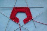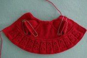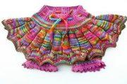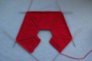 Первое, что необходимо связать из комплекта – это юбка-шорты. Наберите спицами сорок петлиц и вяжите круговые ряды орнаментом «путанка» в количестве пяти штук. Затем выполните 1 р. лицевой глади. В новой полосе следует добавить по 1 п. с двух сторон. Такие увеличения необходимо повторять через каждые пять полос три раза. Потом один ряд вяжется прямо. Отложите в сторону эту заготовку и начните вязать аналогичным образом вторую. После того, как у вас будут готовы две штанины, перенесите их на рабочие спицы и вяжите по кругу лицевую гладь. Когда высота изделия достигнет девять сантиметров, делайте укороченные ряды так, как было описано ранее. Далее на всех оставшихся петельках нужно сделать по кругу шесть полос узором «путанка» и шесть линий лиц. глади. В конце петлицы закрываются.