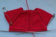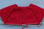 Кофту для куклы необходимо начинать вязать с полочки и спинки. Для этого наберите восемьдесят девять петелек и вяжите основным узором три полосы. В новой линии нужно будет сделать петельку для пуговички по такой схеме: 2 п. по рисунку, затем накид, две совместные лиц. петлицы. Нужно сделать еще такие 4 петельки аналогичным способом, оставляя расстояние между ними 3 см. Когда высота одежки достигнет семь сантиметров необходимо закрыть звенья для пройм таким образом: свяжите двадцать п., потом закройте четыре штучки и свяжите сорок одну петлю, снова закройте четыре и свяжите двадцать. Потом все выполняется по отдельности.