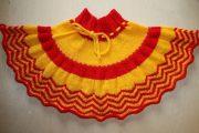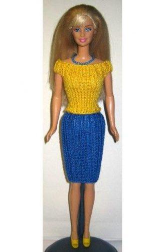 Вяжите одежду до того момента, пока не достигните восьми сантиметров. Чтобы сделать боковые скосы, закройте по 1 п. с боков три раза через каждые три р. Затем провяжите линию с дырочками, делая чередования двух совместных петелек и накида. Последняя полоса будет изнаночной, после чего все звенья закрываются. В дырочки, которые находятся в верхней части юбки нужно продеть тесьму и стянуть одежду на талии куклы Барби. Сшейте кукольную одежду сзади одним швом.