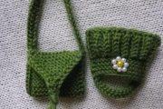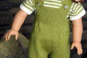 Осталось связать спицами кепку для куклы. Наберите 72 п. и вяжите по кругу 5 р. «путанки». После этого выполните лицевую гладь. Когда высота одежки станет 6 см – уменьшайте петельки, провязывая по две совместные. В конце нитку нужно обрезать, стянуть петли и спрятать край с внутренней стороны. Козырек также вяжется основным узором из 12 п. Уменьшения делайте, когда высота будет 5 см. Убавляйте в каждом 2 р. по 1 п. Пришейте козырек к кепке и обвяжите изделие крючком для красоты. Теперь одежда для игрушек полностью готова.