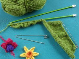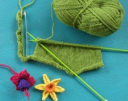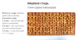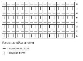 - 4 р. – 6 л. п., поверните изделие и доберите 3 п., перенесите их на другую спицу, поверните и вяжите до конца полосы лиц. п. После этого еще 3 р. свяжите лиц п.;