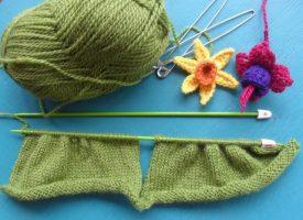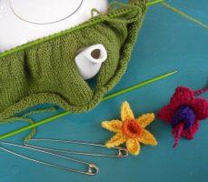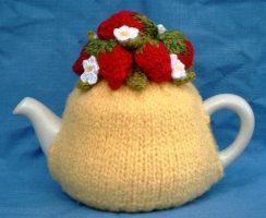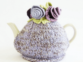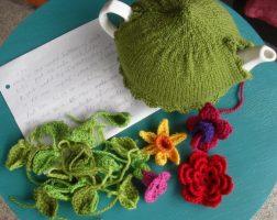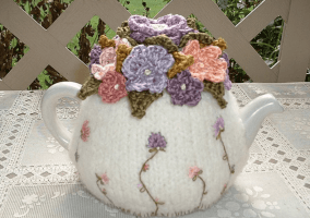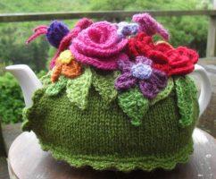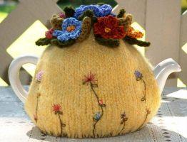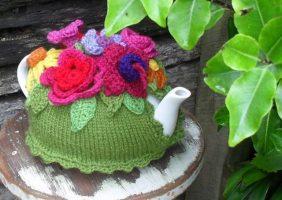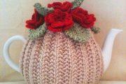 Сама грелочка на чайник связана спицами, а цветы и лепесточки – крючком. Всё изделие вяжем лицевой гладью.