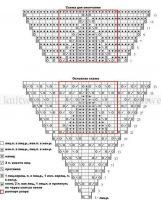Округления для выреза горловинки платка на Коляду, по двум сторонам, а после левая и правая деталь изделия со скосами на тридцать п. делаются на основании схемы. На этапе заключительного закрытия петлиц, для округлений выреза горловинки платка на Коляду, сделайте одну пометку. Провязав пятьдесят один см (= семьдесят два р.) с начала вывязывания выреза горловинки, можно приступать к закрытию всех петлиц.