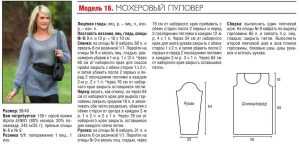 Заканчиваем вещь из мохера резинкой, предварительно в последнем ряду до нее убавив 58 п. резинка формируется на 102 п., как и спинка, и достигает в высоту 7 см. Остается лишь сшить пуловер по боковым швам и изделие готово.
