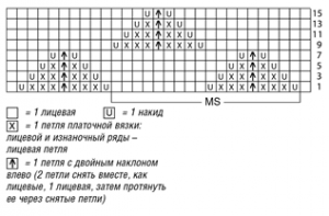 На рисунке выше приведена схема ажурного рисунка. Причем схема содержит только лицевые рядки. В изнанке действуем строго по рисунку и инструкции. Все накиды, которые участвуют в формировании ажура, на изнаночной стороне провязываем строго изнаночными звеньями.