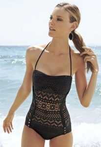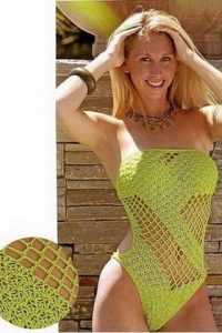Кроме классической модели из двух частей, вязаные купальники бывают с особенными трусиками «Стринги», где открыта для загара зона сзади. Очень популярны также закрытые модели вязаных купальников.