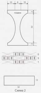 - Плавки вяжем из 66 петель, набирая их и выполняя 2 см рисунком по схеме 1. После этого этапа необходимо сформировать проймы плавок. С этой целью во всех лицевых Р закроем 22 раза по одной петле.