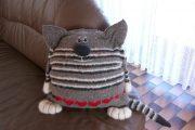 Следующая небольшая подушка с котиком несомненно поднимет настроение всем и каждому. Это трогательный вязаный кот с сарделькой – более чем оригинальный сюрприз на День смеха.