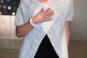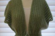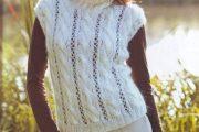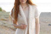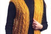 Следующий этап работы будет начинаться с левой полочки. Необходимо набрать 30 п. и вязать лицевой гладью жилет. После 2 р., для проймы делается прибавление с правой стороны в каждой второй полосе три раза по 1 п. и раз по двадцать штук. Выполнив еще восемь полос, делайте прибавление для плечевого скоса в каждой пятой линии 3 раза по 1 п. Безрукавка вяжется дальше в количестве 23 рядов. Чтобы сделать скос левой полочки, нужно закрыть с левой стороны в каждом втором ряду один раз по 10 п., затем три раза по 1 п., раз по девять штук и еще по четыре штучки. Правую полочку из мохера вяжите спицами аналогично левой, только симметрично.