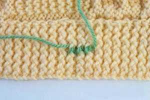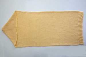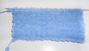 - Так требуется связать до общей длины 125 см. Оставшиеся петли не закрываются, полотно складывается пополам для капюшона и сшивается иголкой с ниткой швом «петля в петлю».