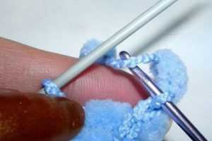 - Потом петли закрываются: 1 лицевая, дальше продолжается крючком – еще раз в первую петлю провязывается 1 воздушная.