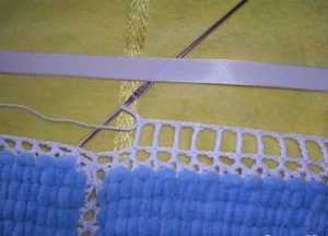 - В получившиеся промежутки вплетается атласная лента по всему периметру, но не туго, чтобы не стягивалось полотно. Можно оставить в таком виде, а можно еще связать кружевной ряд по схеме.