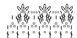 - Второй ряд: в столбик нижней строчки вяжется столбик с тремя накидами, между ними 3 воздушных. Если лента широкая, то можно сделать не три, а больше накидов во втором ряду.