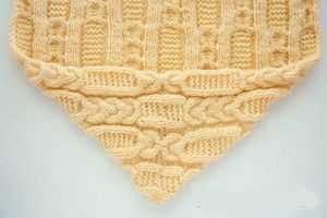 - Продолжается вязание до следующего маркера и повторяется операция с контрастной нить, так всего десять раз. После этого еще идет 2 см планки и завершается вязание.