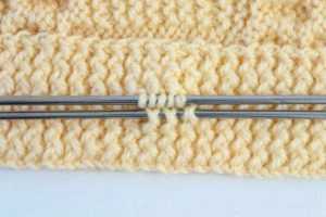 - Затем идет обычная вязка: лицевая гладь или платочная вязка. Наборное количество петель определяется по плотности вязания и выбранного способа вязки.